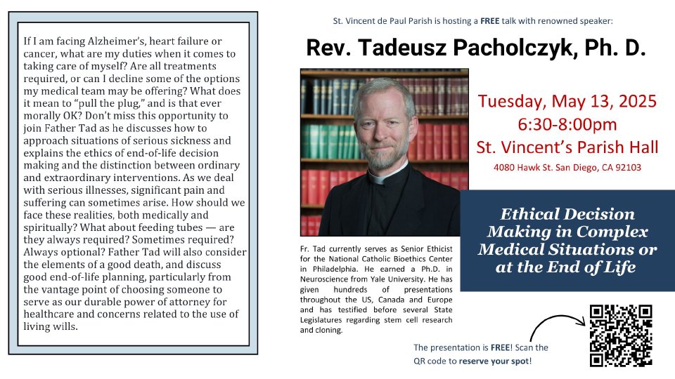 If I am facing Alzheimer’s, heart failure or cancer, what are my duties when it comes to taking care of myself? Are all treatments required, or can I decline some of the options my medical team may be offering? What does it mean to “pull the plug,” and is that ever morally OK? Don’t miss this opportunity to join Father Tad as he discusses how to approach situations of serious sickness and explains the ethics of end-of-life decision making and the distinction between ordinary and extraordinary interventions. As we deal with serious illnesses, significant pain and suffering can sometimes arise. How should we face these realities, both medically and spiritually? What about feeding tubes — are they always required? Sometimes required? Always optional? Father Tad will also consider the elements of a good death, and discuss good end-of-life planning, particularly from the vantage point of choosing someone to serve as our durable power of attorney for healthcare and concerns related to the use of living wills.