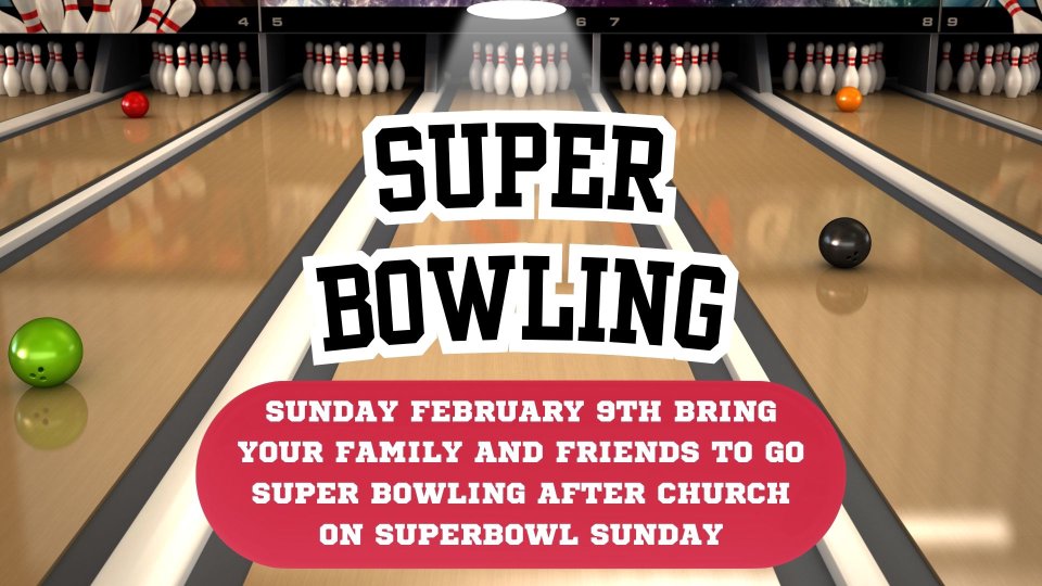 Sunday, February 9th bring your family and friends to go Super Bowling after church on Super Bowl Sunday at 1pm-3pm. The price is $15 per person on February 9th at the Bowling Alley. Don't worry we will all be back for the Super Bowl game!