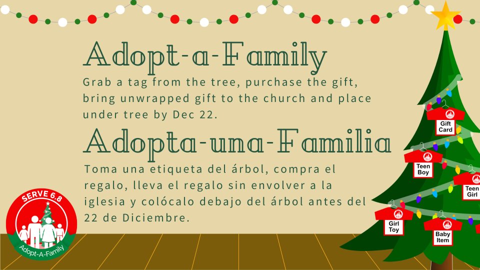 La colección de regalos de Adopt-A-Family es un momento en el que puedes bendecir a otras familias de nuestra comunidad con regalos que quizás ellos mismos no puedan proporcionar. ¡Coge un adorno del árbol, compra el juguete y tráelo (sin envolver) a la iglesia! ¡O puede hacer clic en el enlace a continuación para donar en línea!