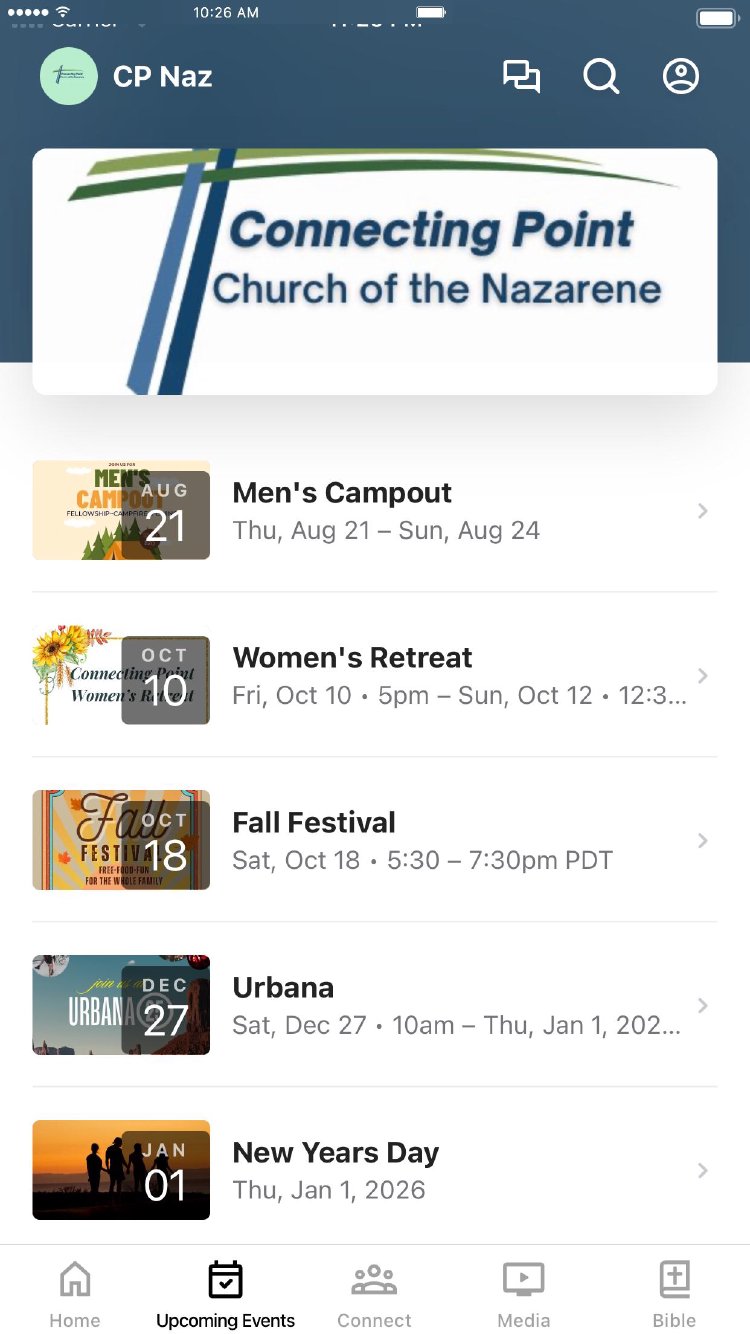 This app is your best place where you can: - Watch or listen to Connecting Point Church of the Nazarene's messages - Stay up-to-date and sign-up for upcoming events - Download messages for offline listening - Make a secure gift - Join Connect Groups - Join Growth Classes