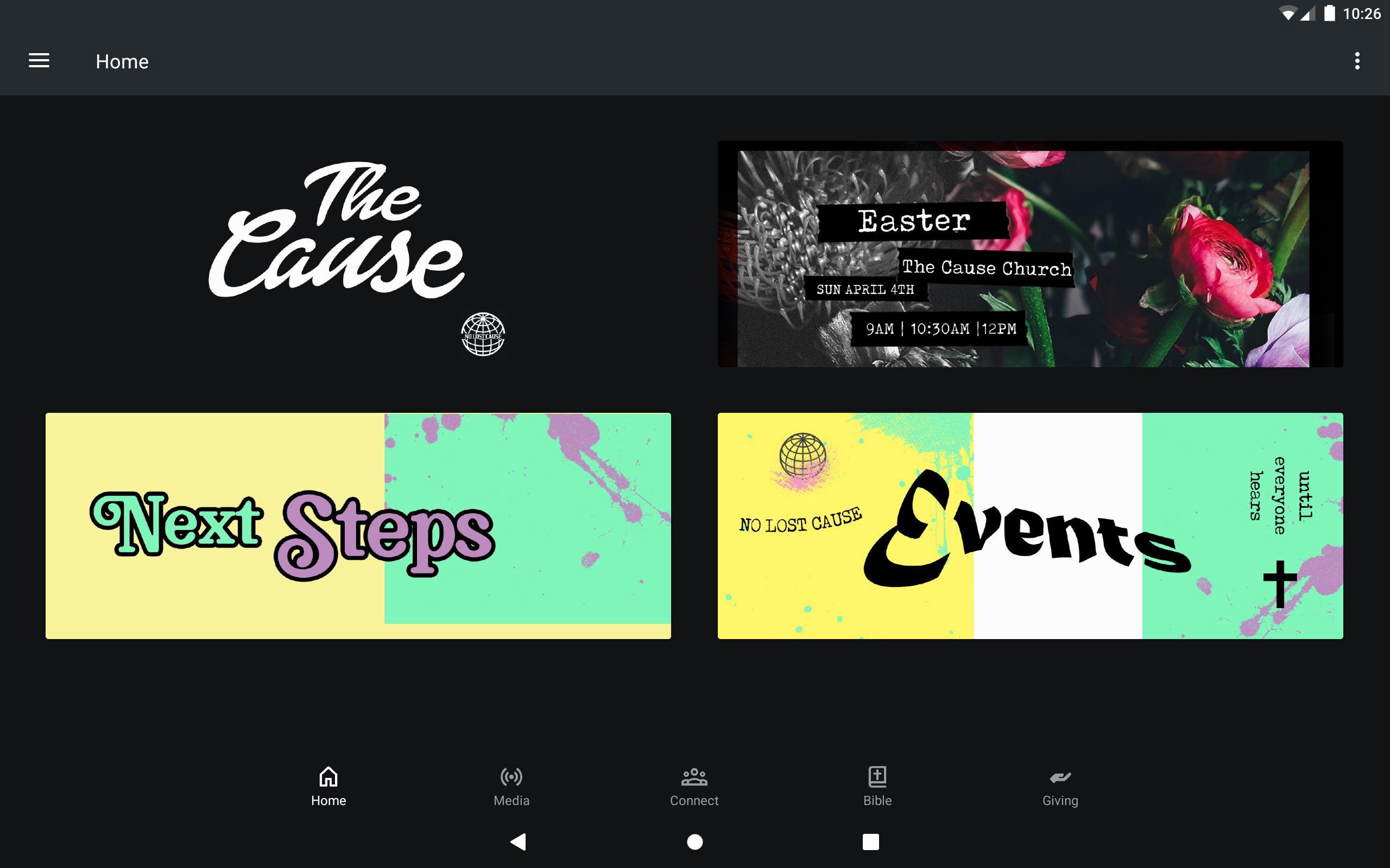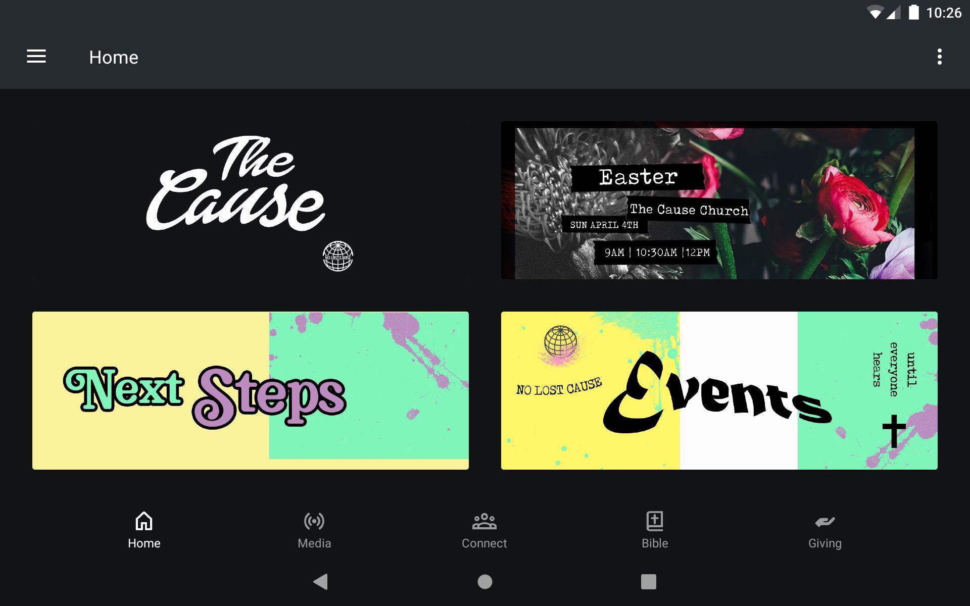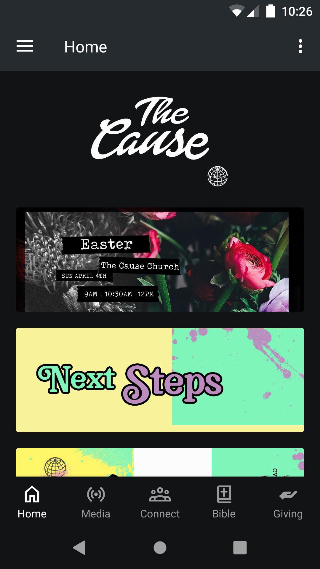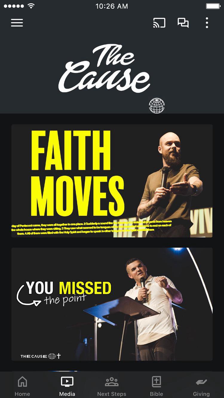 This app will help you stay connected to The Cause Church. With this app you can: watch or listen to past messages; stay up to date with push notifications; share your favorite messages via Twitter, Facebook, or email; and download messages for offline listening. You can also see upcoming events, give and use one our bibles.