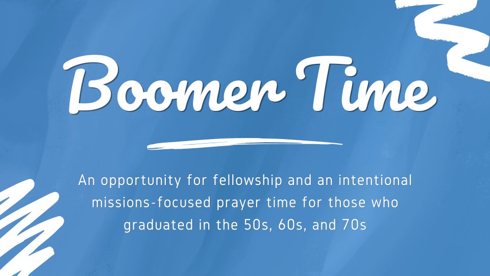 Boomer time is a monthly missions-focused prayer time for our senior adults. Once a month, we meet at Bridge from 10:00 - 11:30 AM for this time of prayer and fellowship. We would love to have you join us!