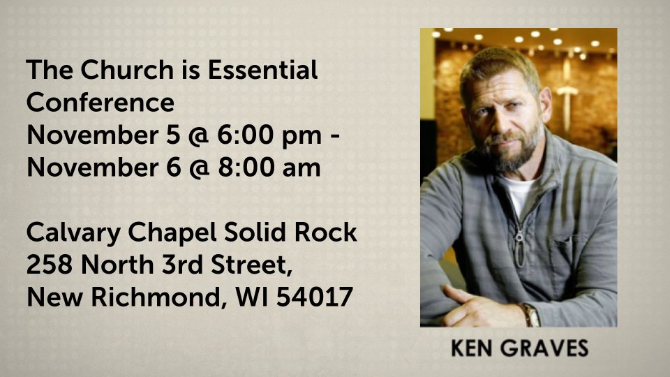 Come out to Calvary Chapel Solid Rock in New Richmond, WI for a weekend with Pastor Ken Graves from Calvary Chapel Bangor, ME. 2 Sessions on Friday night and 1 session on Saturday morning: Basic Itinerary for the conference, November 5th 6:00pm - 7:15pm Session 1 : Ken Graves 7:15 - Break 7:45pm-9pm Session 2 Ken Graves November 6th 8-9am Cooked breakfast for whoever wants to come 9:15-11am Session 3: Ken Graves