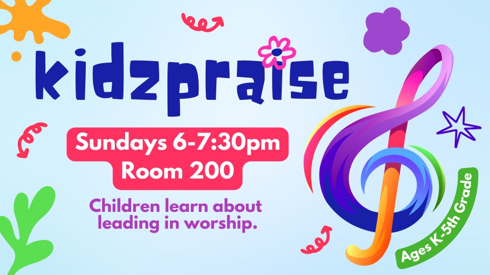 KidzPraise is for children Kindergarten through 5th grade and takes place on Sunday nights from 6pm-7:30pm. Children learn about leading in worship and have the opportunity to participate in leading multi-gen worship services as well as a children's musical.