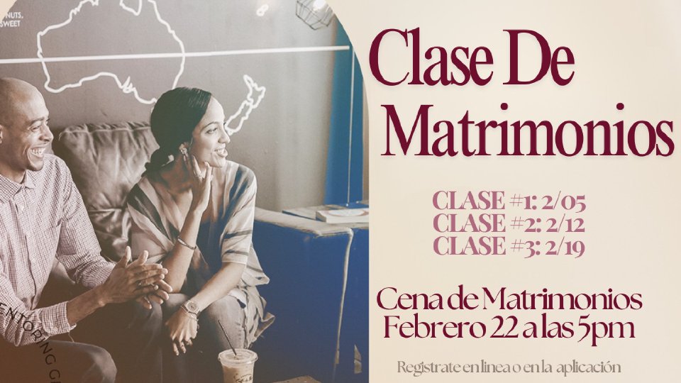 La Cena de Parejas es una oportunidad especial para celebrar y fortalecer tu relación en un ambiente romántico y lleno de propósito. Únete a nosotros el sábado 22 de febrero a las 5:00 PM. El costo es de $65 por pareja. ¡No te lo pierdas!
