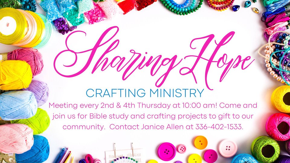 Sharing Hope meets each 2nd and 4th Thursday from 10:00 am - 12:00 pm. Each meeting includes a short devotional followed by craftwork. No special skills are required, there is something for anyone at any level to do. You are welcomed/encouraged to bring your lunch and enjoy a time of fellowship.