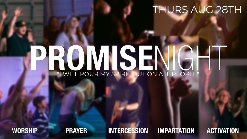Join us Thursday, August 28th for a night of worship, prayer, intercession, impartation, and activation. Promise Night exists to stir a desire for the Acts 2:17 promise of the Holy Spirit's outpouring, in both Word & Spirit, as we anticipate our annual Promise Conference. Join us to pursue the Holy Spirit together! Kids ministry will be provided, so bring the whole family!