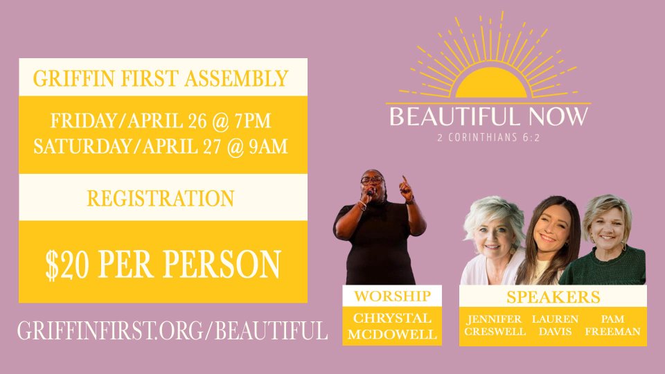 Dear Ladies! You are BEAUTIFUL because GOD created you! HE has a purpose for you! HE wants to you be confident in HIS design. HE loves you more than you will ever know. Beautiful Now is time for us to come together and get to know each other, but more importantly it is a time for us to join together and spend time getting to know our FATHER better! This two day event will be a gorgeous combination of time in His presence through worship and listening to dynamic speakers. We would love for you to join us on April 26 & 27, 2024. Come, bring a friend or two and prepare your heart for a Beautiful transformation!