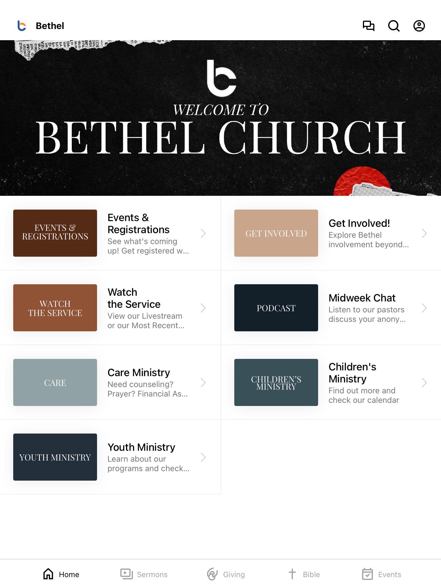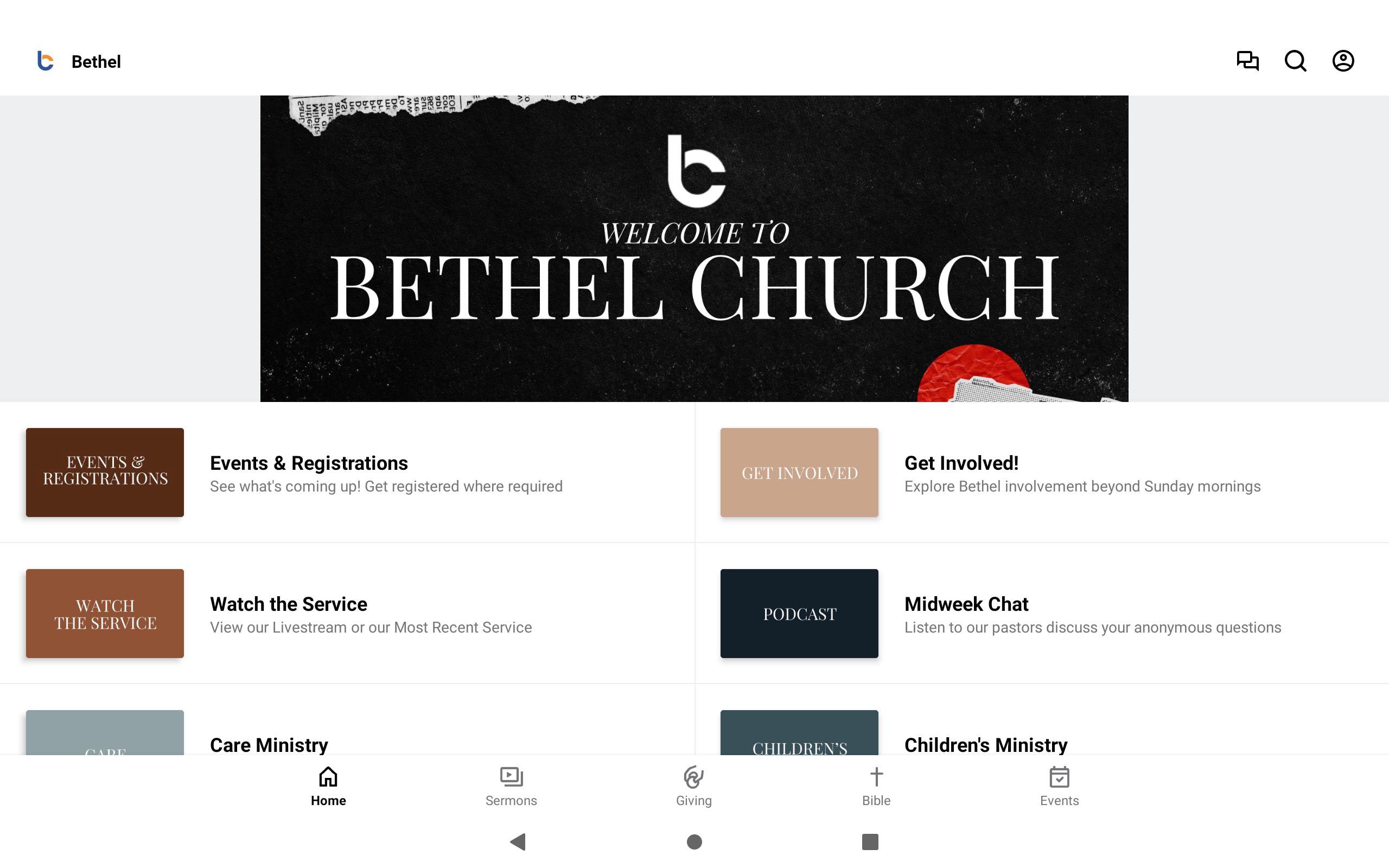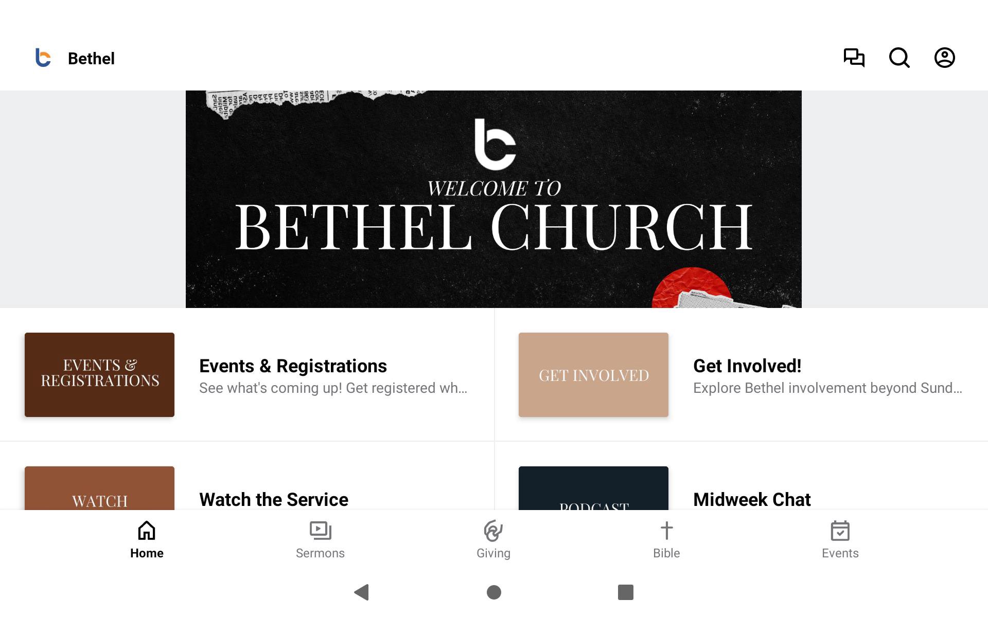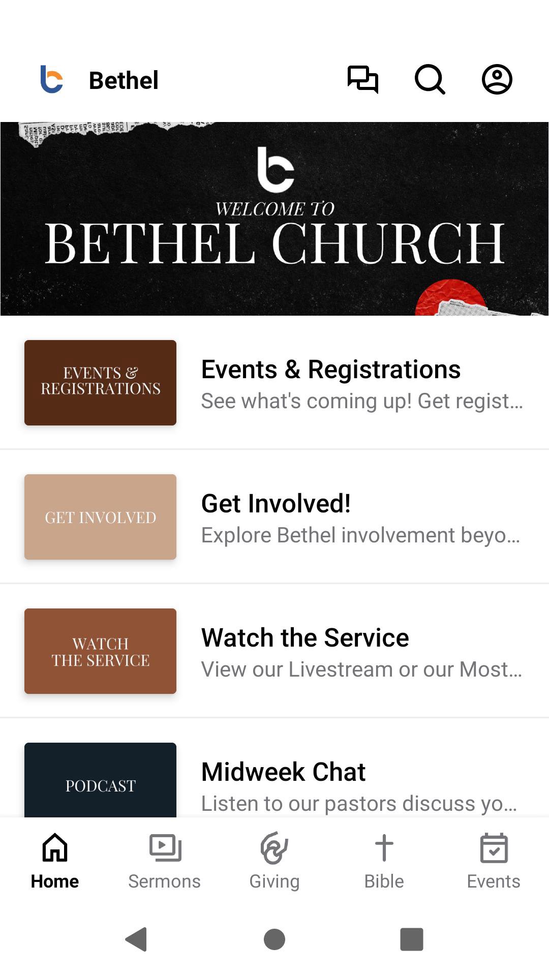 This app will help you stay connected with the day-to-day life of our church. With this app you can: - Connect with others and grow in your walk with Jesus - Find out what's going on at Bethel - Learn how to use your gifts by exploring volunteer opportunities - Make donations and payments for activities with ease - Send messages among your Bethel church family - Stay up to date with push notifications - Watch or listen to past messages