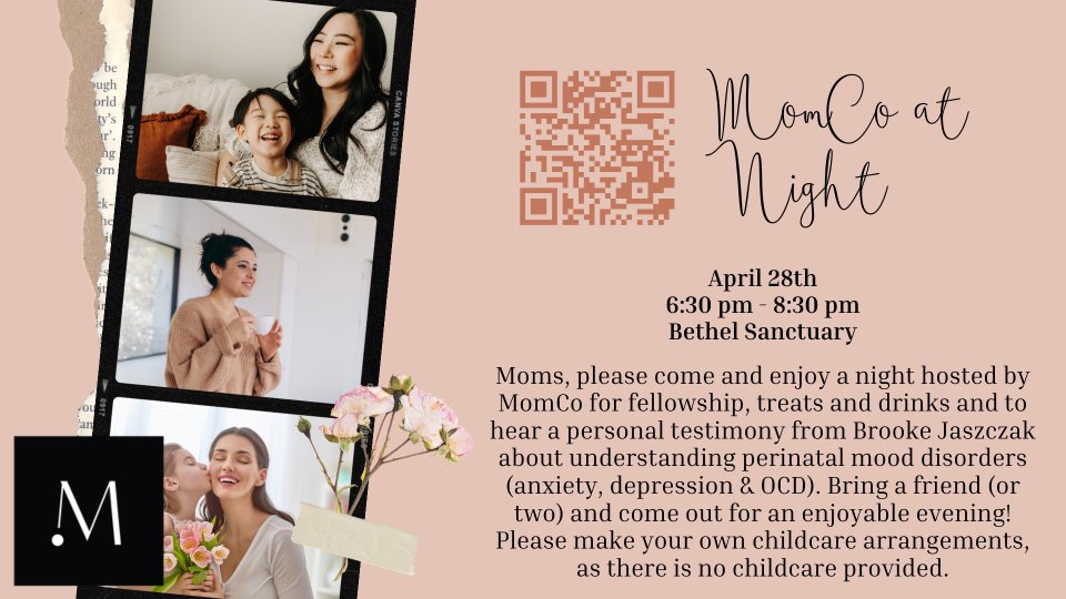 Moms, please come and enjoy a night hosted by MomCo for fellowship, treats and drinks and to hear a personal testimony from Brooke Jaszczak about understanding perinatal mood disorders (anxiety, depression & OCD). Bring a friend (or two) and come out for an enjoyable evening! Please make your own childcare arrangements, as there is no childcare provided. Meet in Bethel Church Sanctuary!