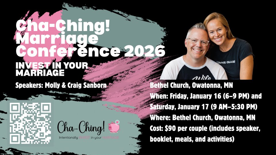 SPEAKER BIO: Craig and Molly Sanborn are a dynamic husband-and-wife speaking team with a heart for strengthening marriages, families, and faith. They combine Craig’s 30 years in youth ministry and Molly’s background in marriage and family therapy to bring practical wisdom, biblical truth, and plenty of humor to every event. As national speakers with FamilyLife’s Weekend to Remember conferences, they connect deeply with audiences across all stages of life. Join them for Cha-Ching: Intentionally Invest in Your Marriage—a faith-filled, inspiring experience that helps couples turn everyday choices into lasting joy and intimacy.