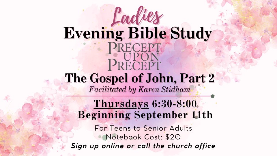 If you are a woman and would like to participate in the Precept Bible Study for the Gospel of John: Part 2 you can sign up here. This will be an 8 week Bible study beginning on Thursday, September 11 at 6:30 pm at the church. The teacher, Mrs. Karen Stidham, will be in contact with you as the Bible Study date approaches with more information.
