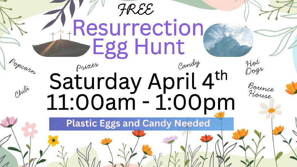 Calling all kids and parents!! Join us on Saturday, April 4th from 11am-1pm for our FREE Resurrection Egg Hunt. There will be raffles, prizes, candy, food, bounce house and of course.....thousands of eggs! Invite your family and friends! Hope to see you all there!!!