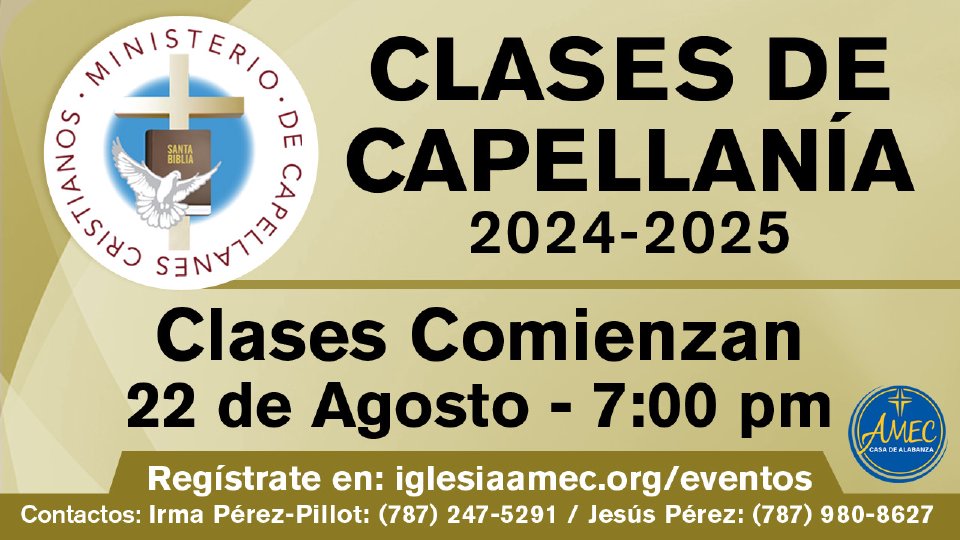 La Iglesia AMEC Casa de Alabanza y el ministerio de Capellanes Cristianos les invita a sus clases de capellanía.