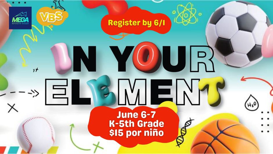 MEGA Sports Camp® In Your Element invita a los niños a descubrir quiénes son los que Jesús ha creado para ellos. Estar en su elemento significa prosperar en su entorno y sobresalir en las fortalezas que Dios les ha dado. Los niños están en su elemento cuando tienen una relación con Jesús. Esta semana, los niños aprenderán de la vida de Pedro, discípulo de Jesús, cómo es estar en su elemento.