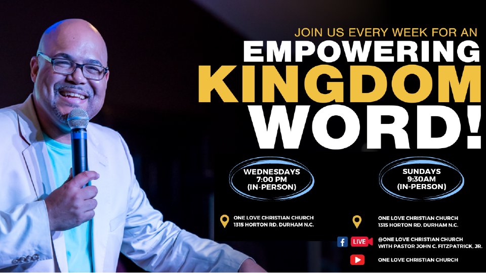 Join One Love on Sundays at 9:30am for Sunday Morning Worship Service live at the church. All are welcome to attend the live service. If you cannot join us at the church, you can also view the service on our Church App (OLCC DURHAM) or via Facebook Live or on One Love's YouTube Channel (One Love Christian Church). Note -- Masks are optional. If you have questions or need additional information,, contact the Church Admin at 984-259-4524.