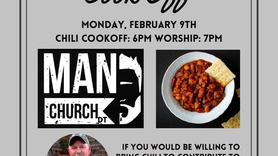 We will be hosting ManChurchDT on Monday, February 9th, open to all men and boys in our community. At 6 we will have a chili-supper - pots of chili from our church and other churches will be presented for judging and EATING! Prizes will be awarded. Chili supper at 6pm, Worship at 7. Steve McCann will be guest speaker. No cost.