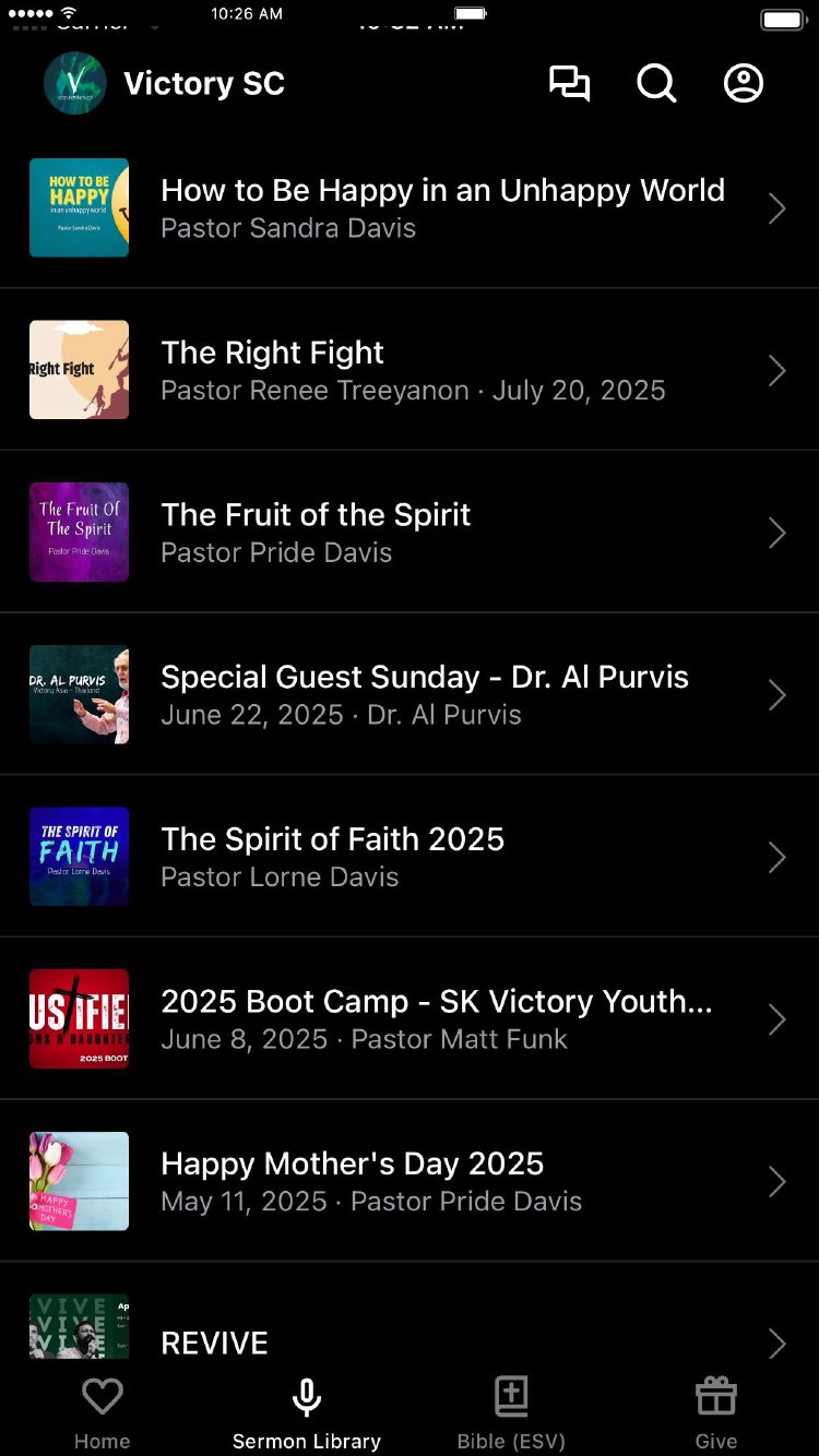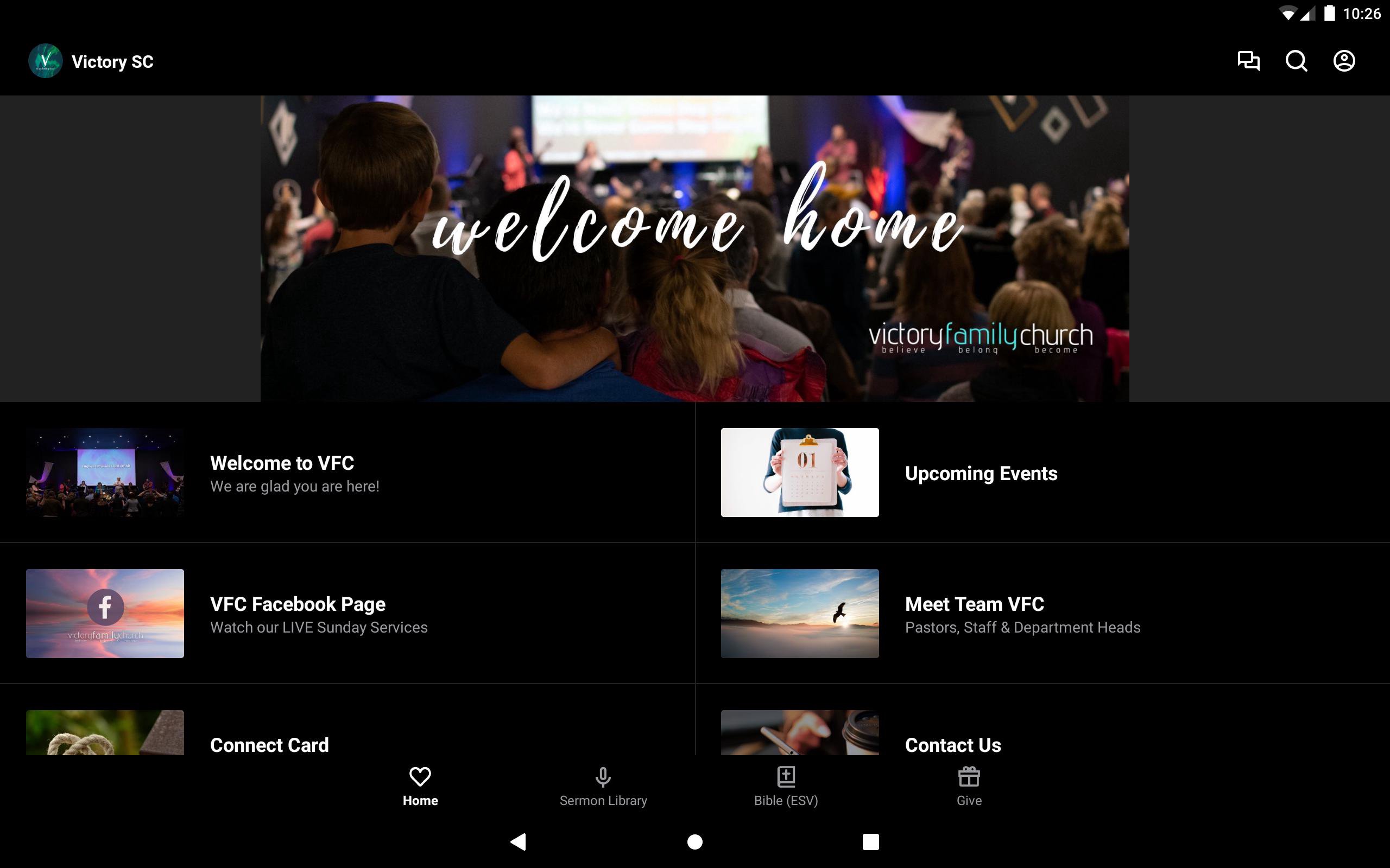 Connect to Victory Family Church SC and get the latest sermons, news, resources, and more delivered right to your mobile device. With The Church App, you can easily watch and listen to sermons on the go, download media for offline listening, find and register for events, read blog articles, read the Bible, give tithes/offerings, take notes in church, and much more. Other Features: -in-app messaging for church community and teams -access your notes across all of your devices -look up Bible passages and follow along with Bible reading plans -be the first to receive updates from VFC -easily share content with your friends and family -fuel the mission of all VFC's ministries locally, nationally and around the globe with quick, secure giving.
