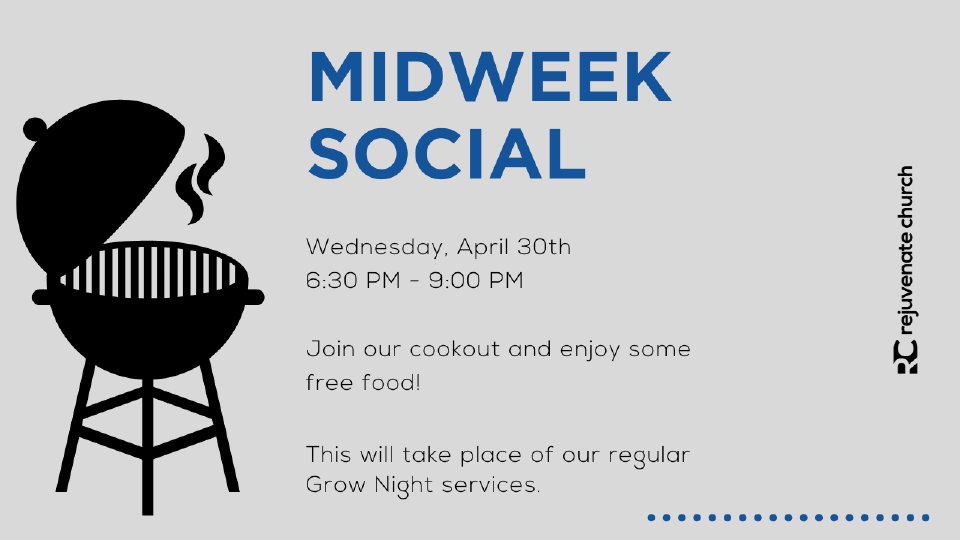 This week, we're setting aside our regular service for a special Midweek Social, a time to come together in prayer and fellowship. From 6:30 to 7:00 PM, we’ll have corporate prayer. Then, after prayer, we’ll fire up the grill and enjoy a free meal together—a time to relax, connect, and build relationships as a church family.