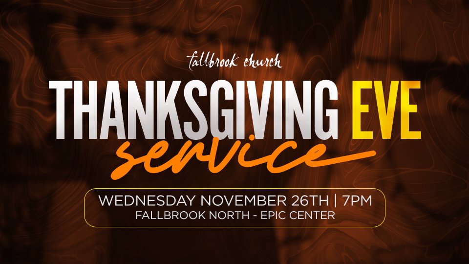 Join us for an exceptional Thanksgiving Eve Service as we prepare for the Thanksgiving Holiday on Wednesday, November 26th, at 7 p.m. in the EPIC Center. We will worship and have a special Thanksgiving Eve meal together. We are located at the Fallbrook North Campus (location address listed on your right).