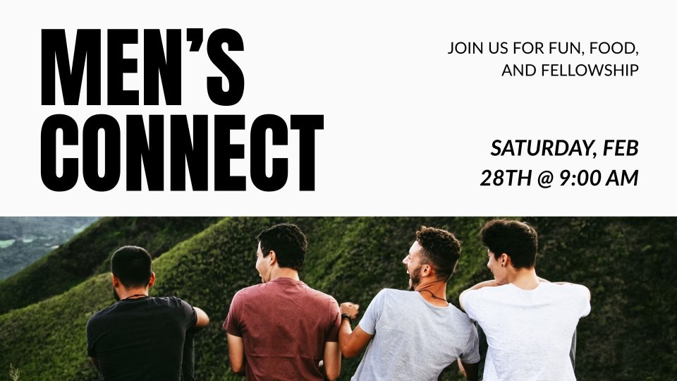 Join us for our next Men’s Connect on Saturday, February 28th at 9 AM right here at the church. Come enjoy great food, real fellowship, and time growing together in Christ.