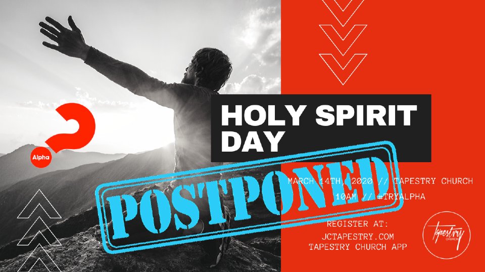 What is Alpha? Alpha is a series of sessions exploring the Christian faith, typically run over eleven weeks. Each talk looks at a different question around faith and is designed to create conversation. Alpha is run all around the globe, and everyone is welcome. At Tapestry Church Alpha is run all year round. What is Holy Spirit Day? The event will consist of food and fellowship, worship, prayer, guest speaker and we'll be viewing Alpha's holy spirit videos (listing below) from the alpha course followed by group discussions. Session 7 - 'Who Is The Holy Spirit?' Session 8 - 'What does The Holy Spirit Do?' Session 9 - 'How Can I Be Filled With The Spirit' Session 10 - 'How Can I Make the Most of the Rest of My Life?’ It is important you register for head count, Any questions contact team leader Sasha - 201-241-9910