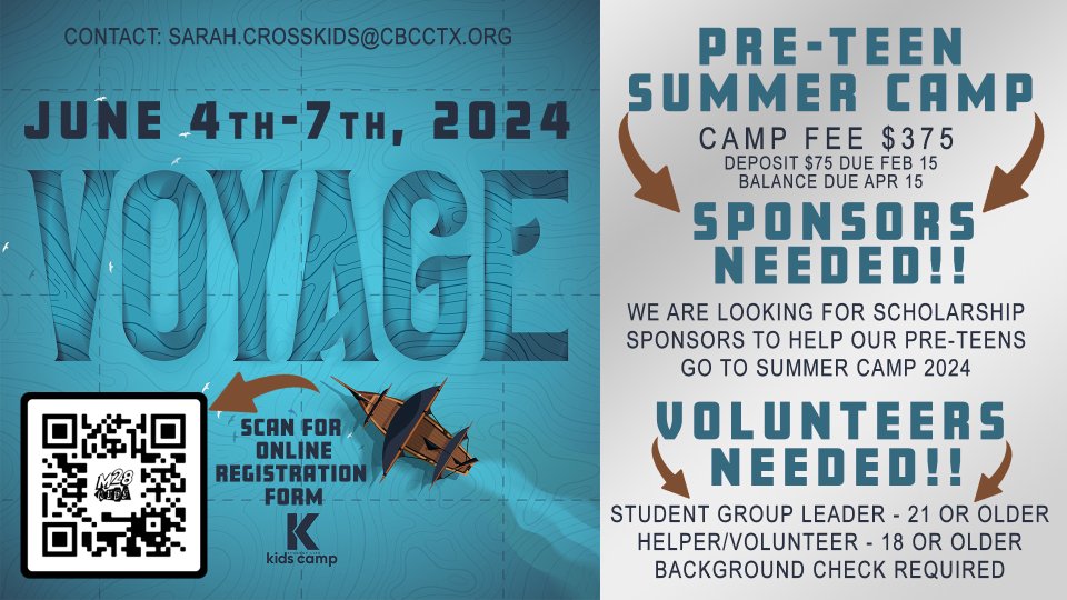 Pre-Teen summer camp June 4-7, 2024 Camp Fee $375 $75 deposit due Feb 15 Balance due April 15 Sponsors needed!! We are looking for scholarship sponsors to help our pre-teens go to summer camp 2024 Volunteers needed!! Student group leader - 21 or older Helper/volunteer - 18 or older Background check required
