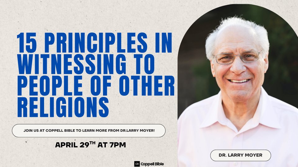 On Wednesday, April 29 at 7:00 pm, Dr. Larry Moyer, a veteran evangelist and member of Coppell Bible, will be bringing a one hour seminar here at the church on “15 principles in witnessing to people of other religions.”