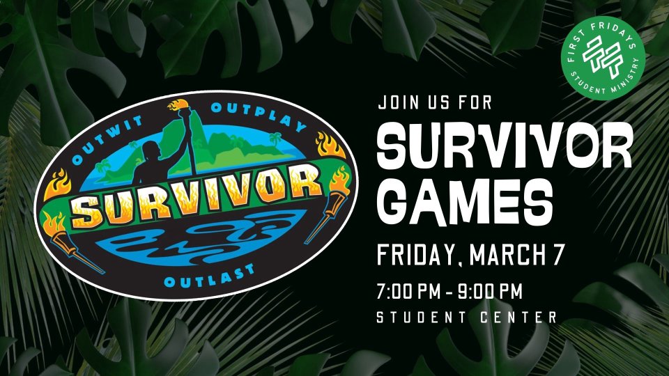 Come join us for a night of Survivor and mini games. Open to all 6th-12th graders.