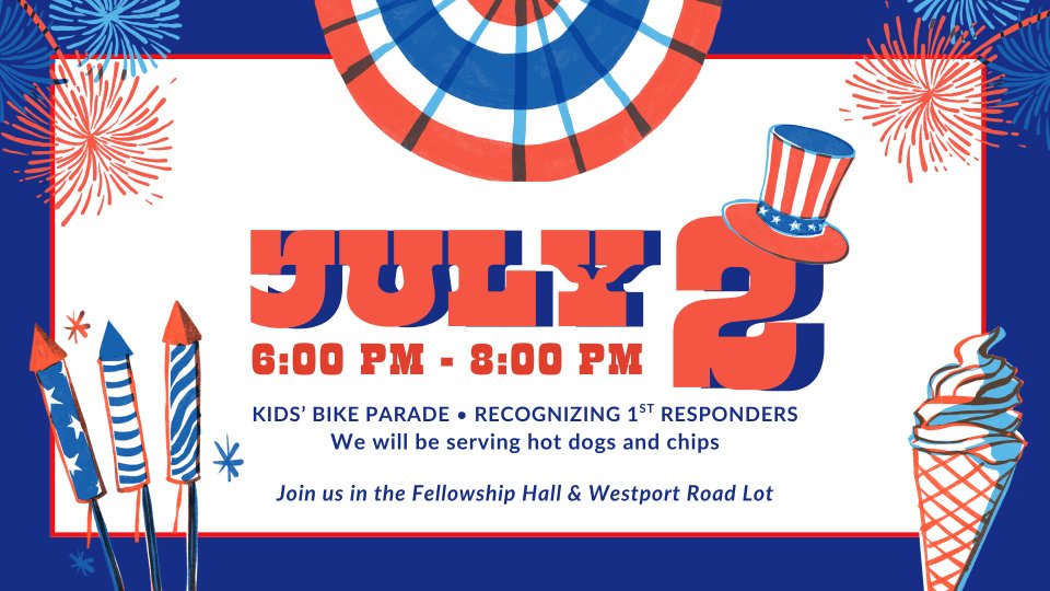 Join us for a fellowship to celebrate the 4th of July. We'll be hosting a bike parade for kids so decorate your bikes! We'll be serving hot dogs and chips. We'll also be recognizing local 1st responders.