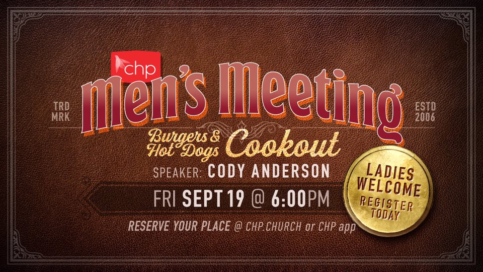 Join Pastor John Kilpatrick for a cookout at CHP! Enjoy a great meal and fellowship, followed by a message from Cody Anderson. We need a headcount to prepare enough food. REGISTRATION CLOSED.