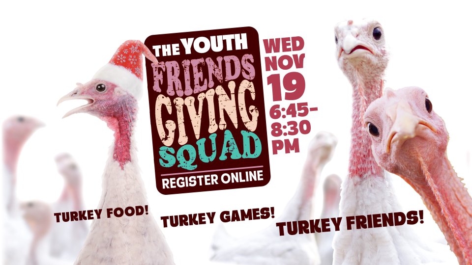 Join us for Youth Friendsgiving—a night to celebrate God’s goodness, play games, and have fun! Enjoy a smoked turkey prepared by your very own Pastor Ryan!