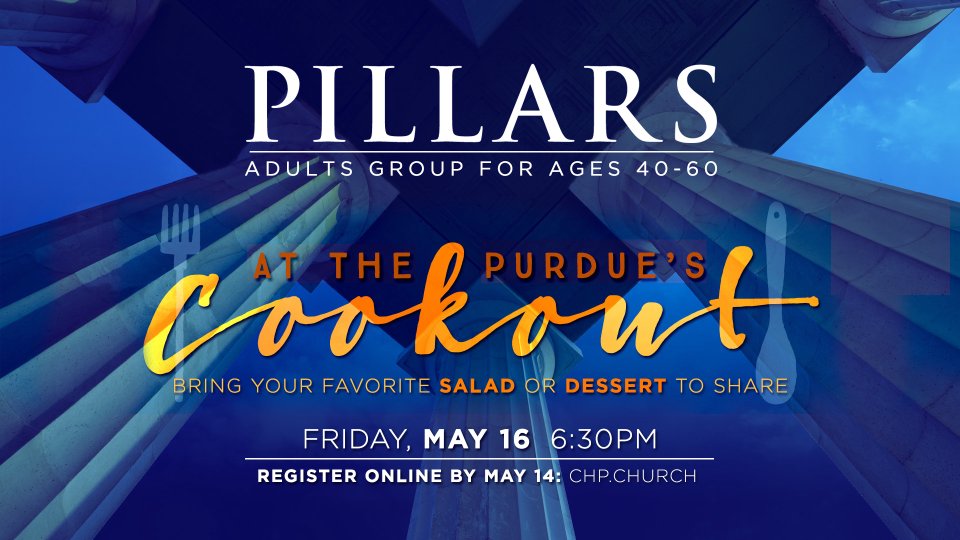 Join Pillars at the Perdue's home for a Friday night cookout. Please bring a salad or dessert to share. Register by Wednesday, May 14.
