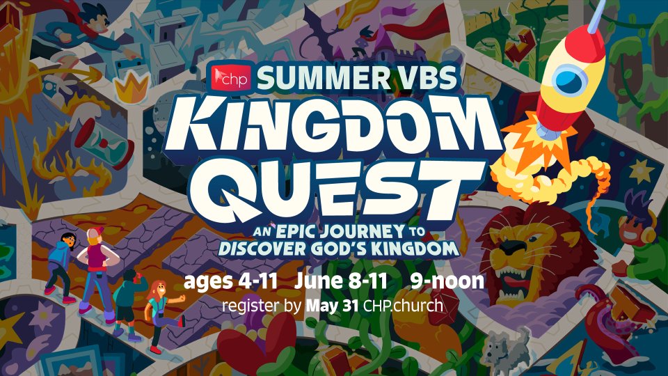 CHP invites all children ages 4–11 to step into a fantastical multiverse adventure at this year’s Vacation Bible School! Join us June 8–11 from 9 AM to Noon, where kids will journey through “Kingdom Quest — An Epic Journey to Discovering God’s Kingdom,” exploring what it means to follow Jesus and live as part of His kingdom. Children will experience a world of imagination through interactive lessons, high‑energy games, hands‑on crafts, music, and Bible stories that point them toward the life and purpose God has for them. Registration closes May 31 — don’t miss it!