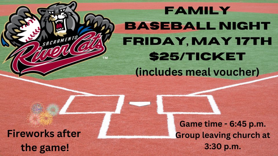 All youth and their families are invited to a Sacramento River Cats on Friday, May 17th! The tickets are $25 each which includes a meal voucher ($12 value). There will also be fireworks after the game!