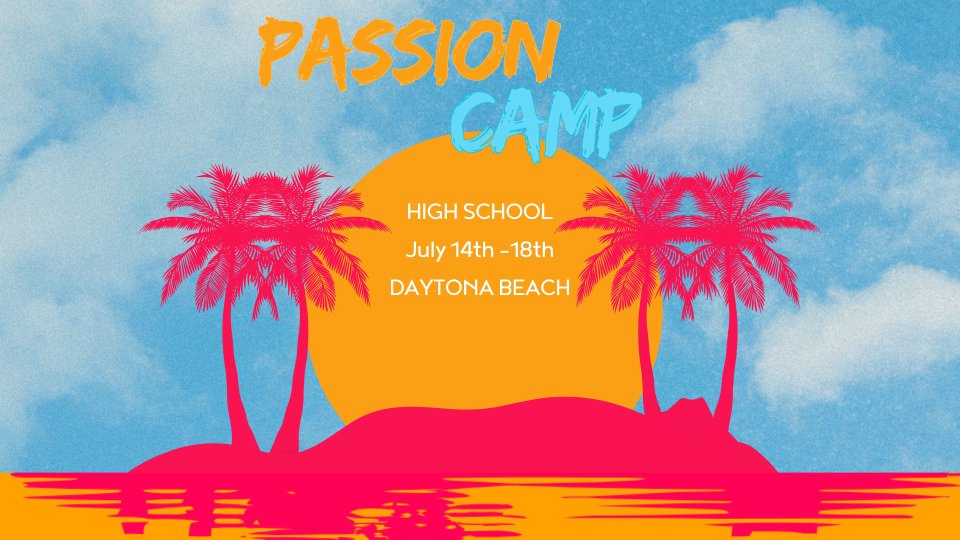 Are you ready for an incredible Summer camp? High School students are invited to join us for Passion Camp '25 in Daytona Beach. Incredible worship, speakers, and Squad Wars highlight the week. This is camp like you've never experienced! The cost covers food, lodging, transportation, and all programming.