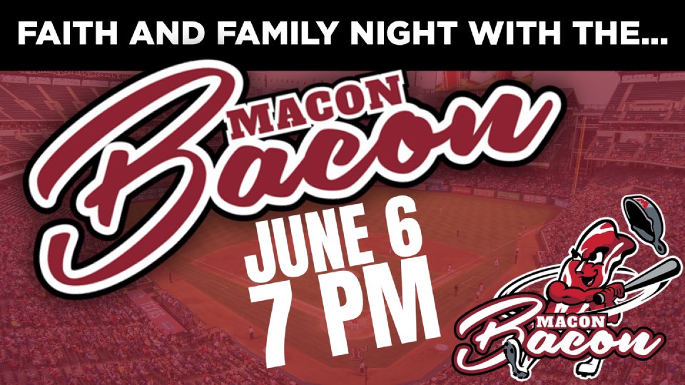 Come out for faith and family night with the Macon Bacon, featuring a post-game time of worship and word from The Hills Worship Ministry and Pastor Jacob! Each ticket includes game admission, a free Macon Bacon hat, and all-you-can-eat burgers, dogs, chicken sandwiches, soda, water, and more!