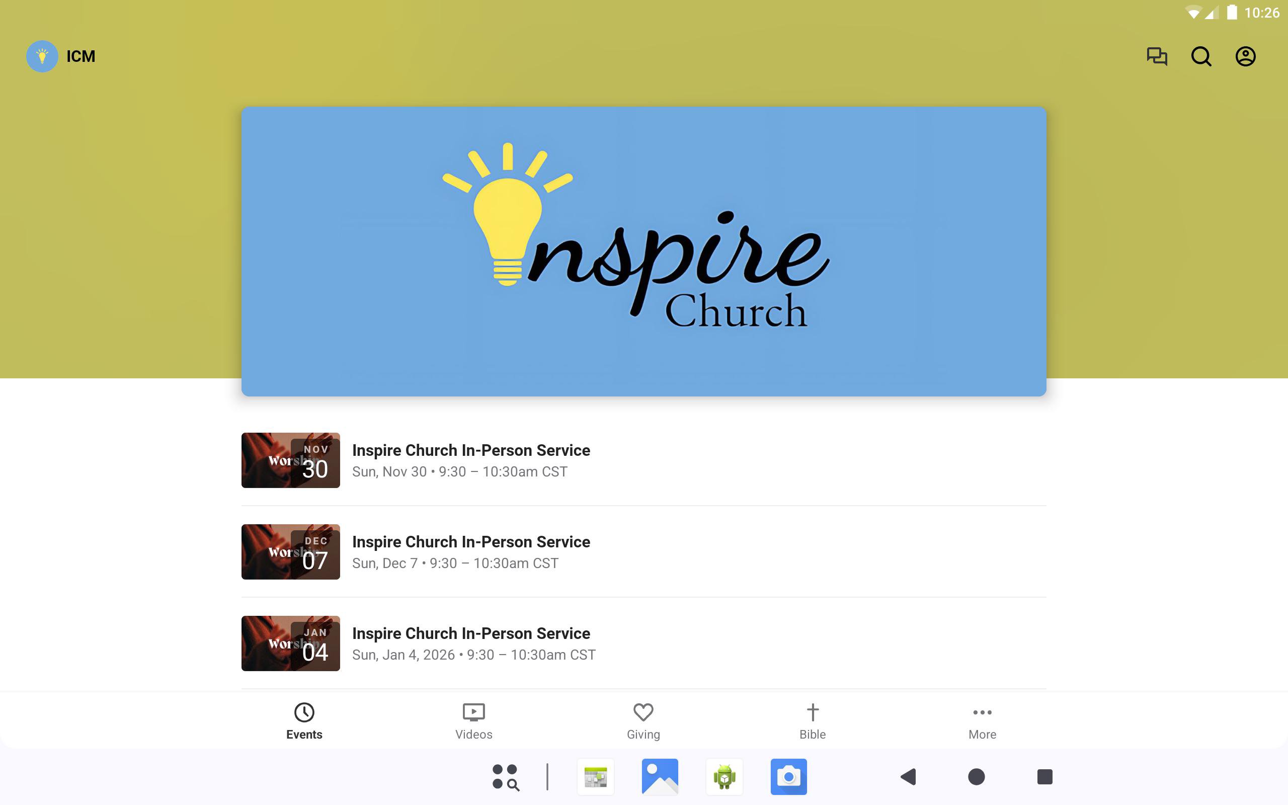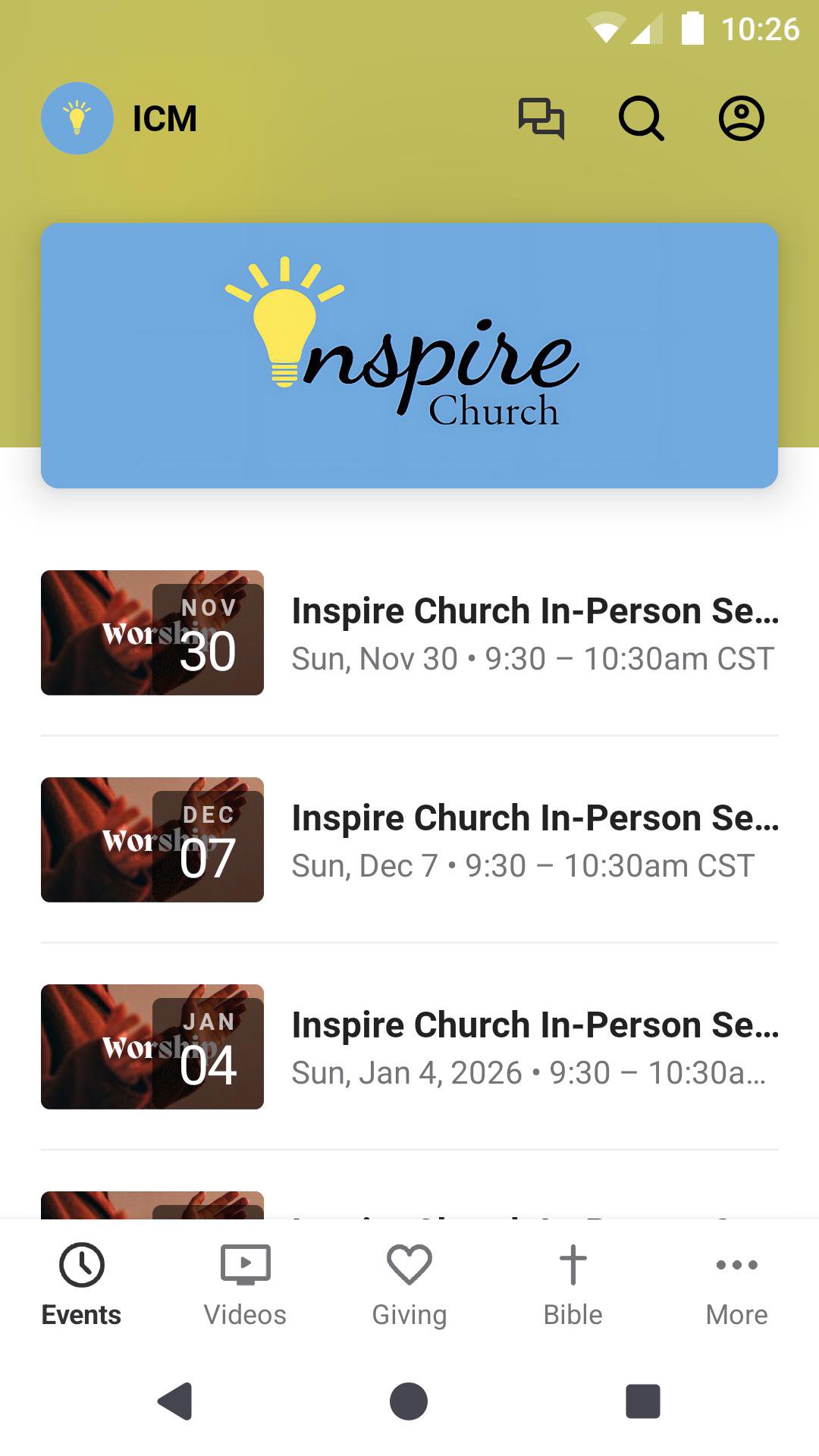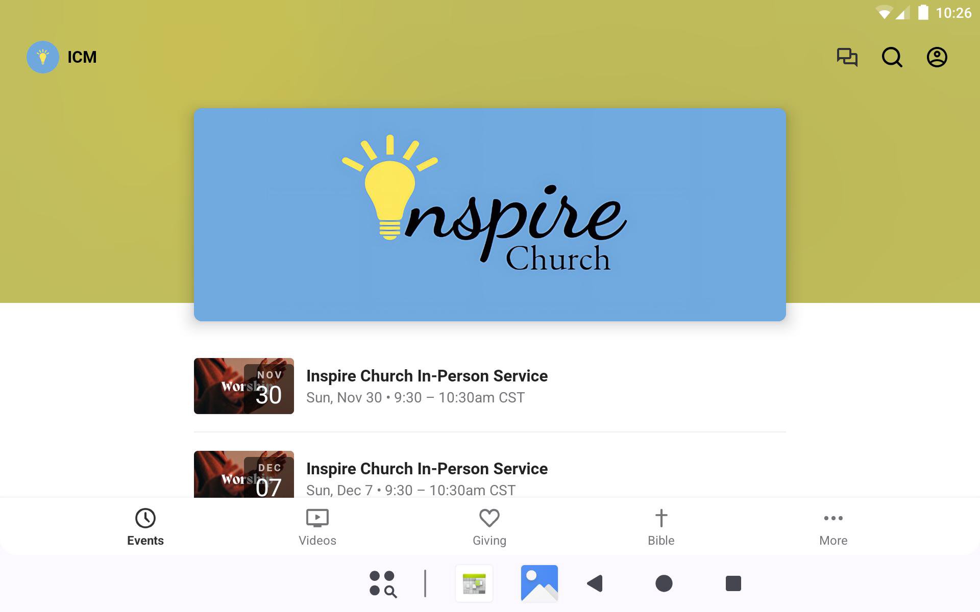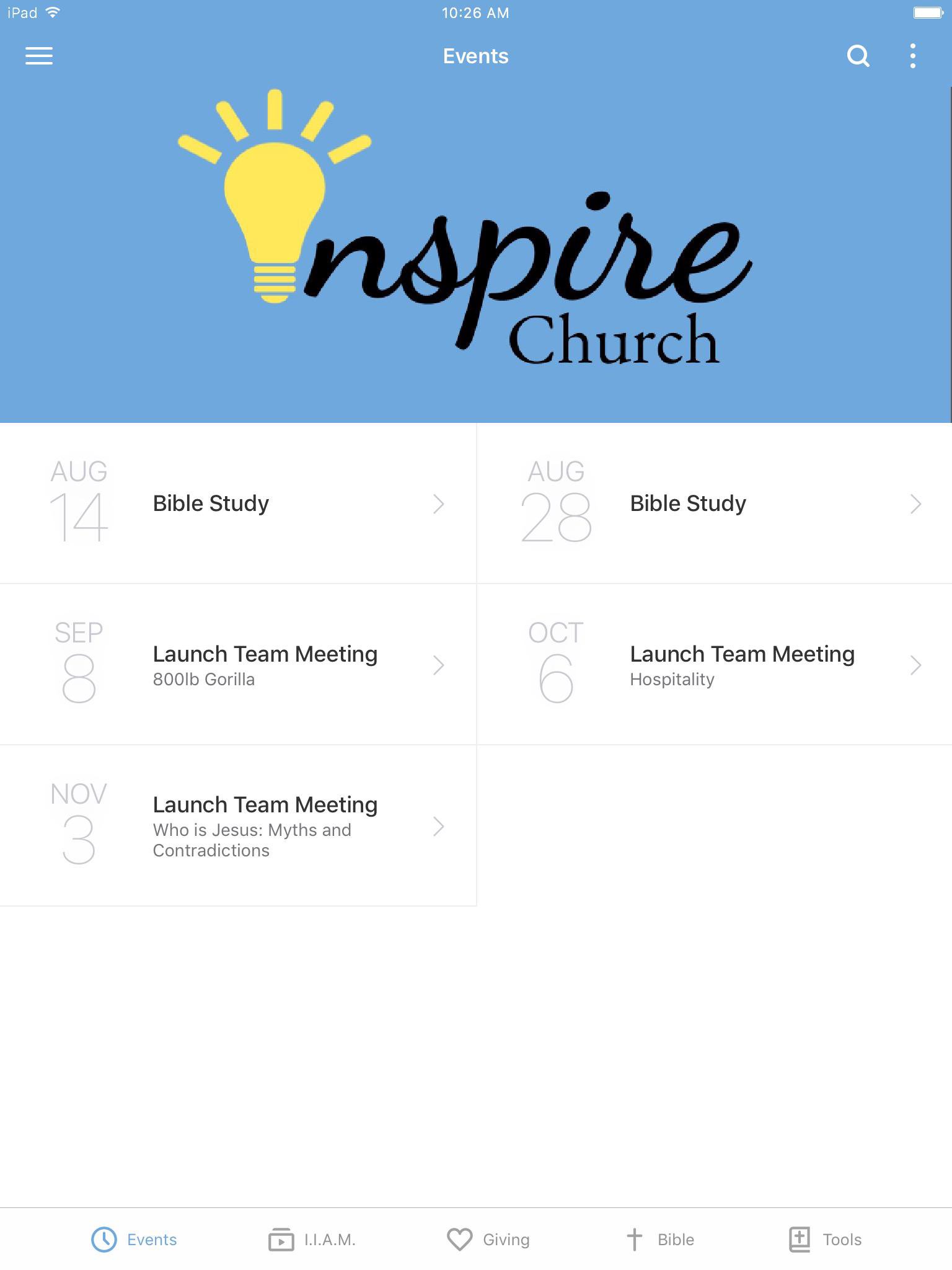 This app will help you stay connected with Inspire Church Memphis. With this app you can: - watch or listen to past messages - stay up to date with push notifications and out event calendar - read or listen the Bible - request prayer - give tithes and offerings