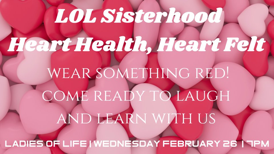 Ladies, this month on the 4th Wednesday, 2/26, we are delving into matters of the heart together with our "Heart Health, Heart Felt" night. We will start off with some much-needed laughter because "a cheerful heart is good medicine" (Prov. 17:22), and we will also have some heart healthy tips followed by a heartfelt message you don't want to miss. So, sign up today, then wear something red and come ready to laugh and learn together with us. We promise you will leave with a heart full of love from your Sisterhood!