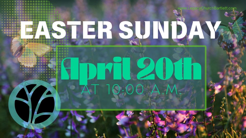 Join us for an Easter Sunday celebration at Legacy Church on April 20, 2025 at 10am. We will be gathering to celebrate the resurrection of Jesus Christ from the dead.