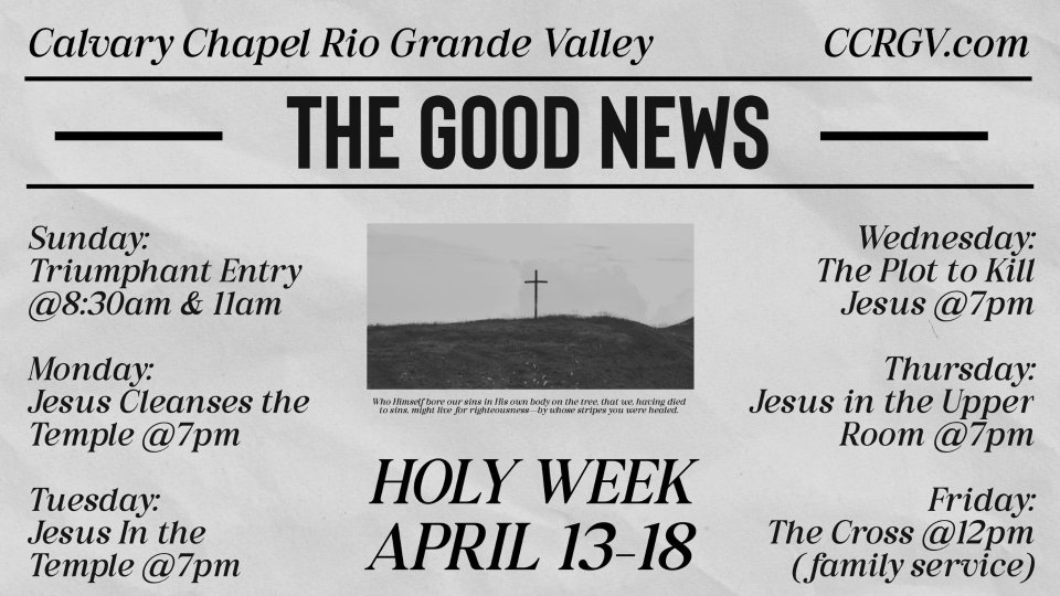 Join us all week starting Sunday, April 13 as we look at the events leading up to the ressurection of Jesus Christ!
