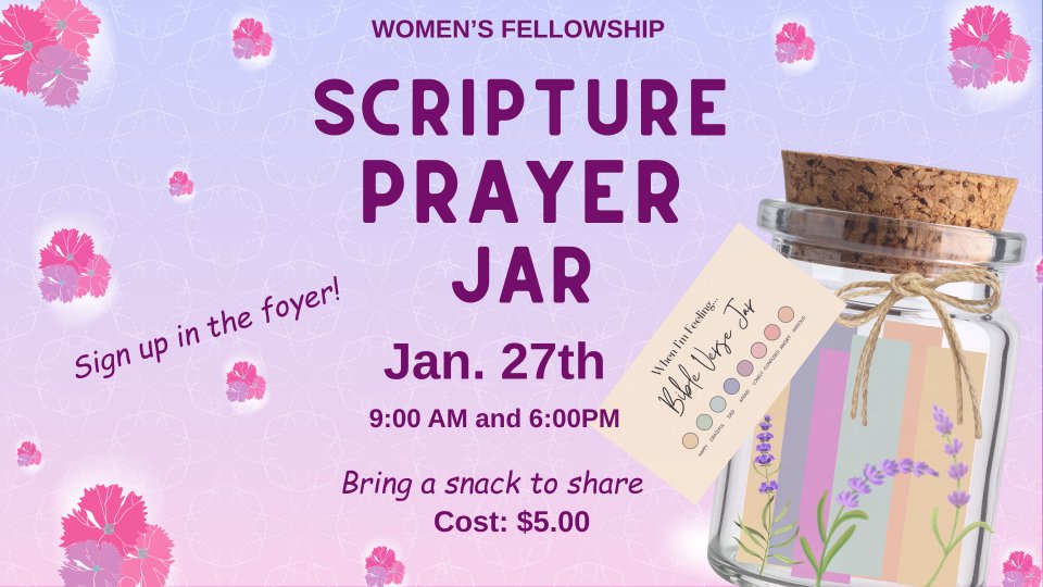 We’re excited to invite women of all ages to our Scripture Prayer Jar event! Spend time in fellowship as you craft a jar filled with Scriptures and learn to pray scripture. It’s a simple, uplifting way to reflect and encourage your heart—and take home a special reminder of faith. Materials will be provided. Please bring a snack to share - Cost if $5.00 per person. Sign up avaialble in the foyer!