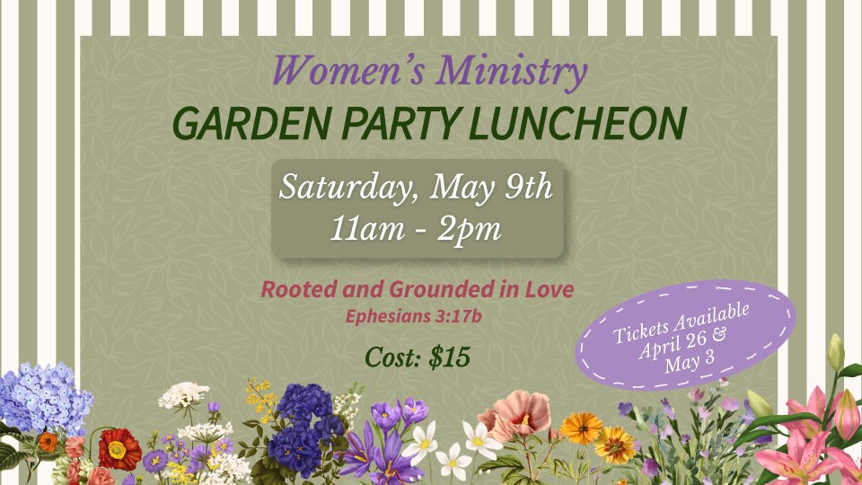 Join us for a delightful Women’s Ministry Garden Party Luncheon on May 9 from 11:00 AM to 2:00 PM as we gather for a refreshing afternoon of fellowship, encouragement, and delicious food.