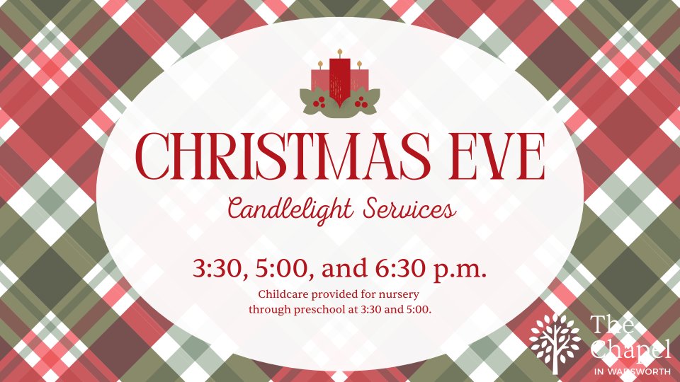 We will have three identical Christmas Eve services with candle-lit carols at 3:30, 5:00, and 6:30 p.m. on December 24. Child care is available during the 3:30 and 5:00 services only, for nursery and preschool-aged children.