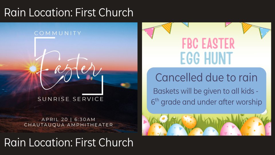 This year's Community Sunrise Service has been moved inside to First Church (325 E. Twin Springs St.) at 6:30AM. Pastor Jeremy will be delivering the message this year. Due to rain, we will have baskets with candy available for all kids 6th grade and under in the lobby after worship. See you at church at 10:45AM to worship our Savior!