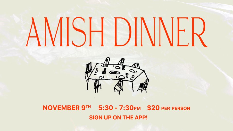 On November 9th we are going to Chouteau, Oklahoma to eat an Amish dinner! The way it works is you sign up on our app or in person, it’s $20 per person, and the meals are served family style. They serve things like rolls, chicken, mashed potatoes, roast, and the best part…the pie! WE ALL MEET THERE. I Then we all sit together and fellowship while being served some amazing food. If you’ve gone before or if it’s your first time going we highly recommend that you sign up. It’s a great way to build relationships with people outside of a Sunday morning.