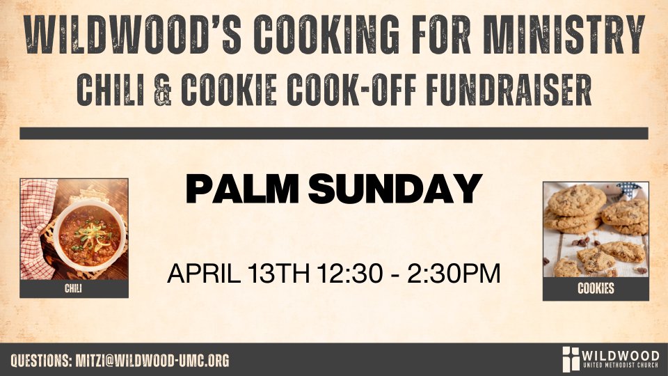 Join us April 13th for Wildwood’s Cooking for Ministry: Chili & Cookie Cook-Off — a rootin’-tootin’ good time after worship! Taste, vote, or cook to support ministries in a fun (and delicious) way.