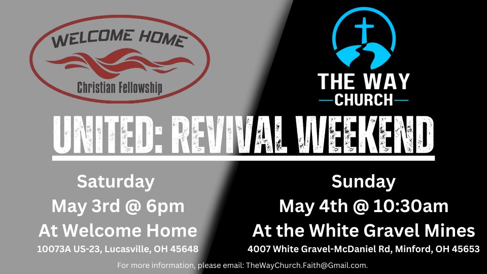 Join us for a powerful weekend of faith, worship, and community as Welcome Home Christian Fellowship and The Way Church come together for a joint revival event centered on One Mission, One Purpose, One Heart. This is a unique opportunity to experience two churches uniting to bring hope, renewal, and transformation to our community.