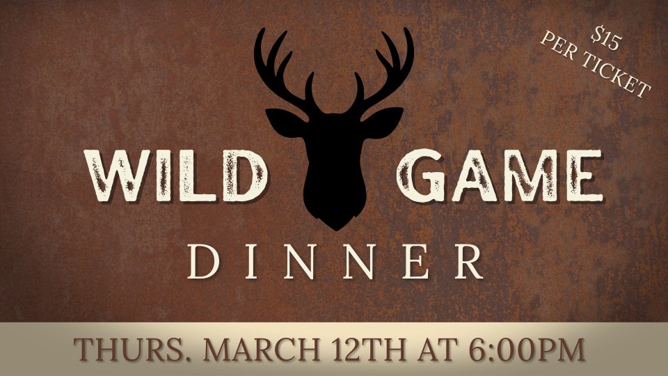 Men, mark your calendars for our annual Wild Game Dinner on Thursday, March 12th, at 6:00 p.m. Tickets are $15 and are available for purchase!
