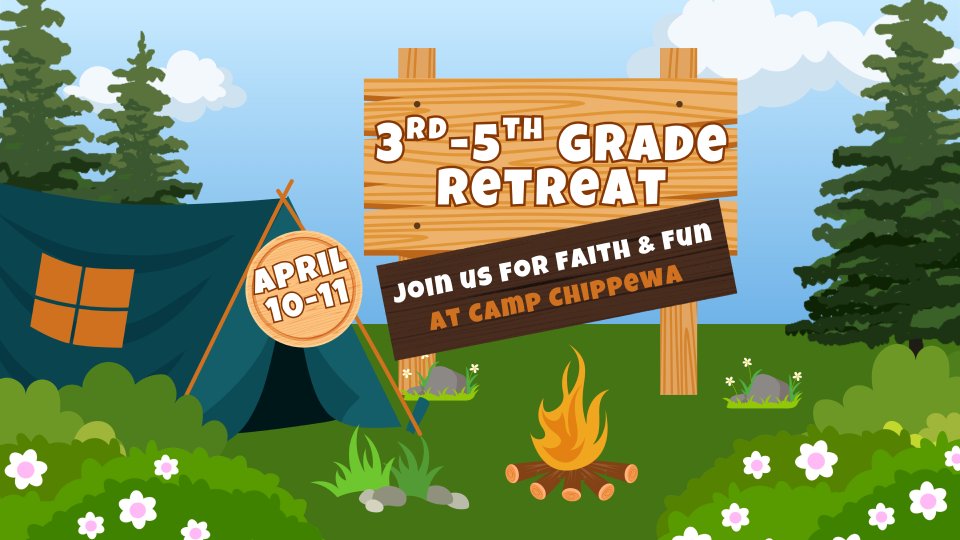 3rd-5th graders are invited to join us for a retreat full of faith and fun on April 10-11th at Camp Chippewa. Each child is welcome to bring their safe gatherings approved grown up. We will gather at the church on April 10th at 5 pm and head to camp for 24 hours of experiencing God at camp together.